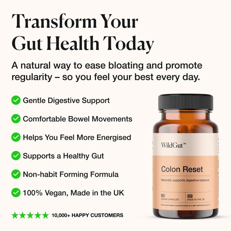 WildGut Colon Reset is a dietary supplement designed to support regularity and overall digestive health. Made in the U.K., each bottle contains 90 capsules featuring a gentle blend of plant-based ingredients.